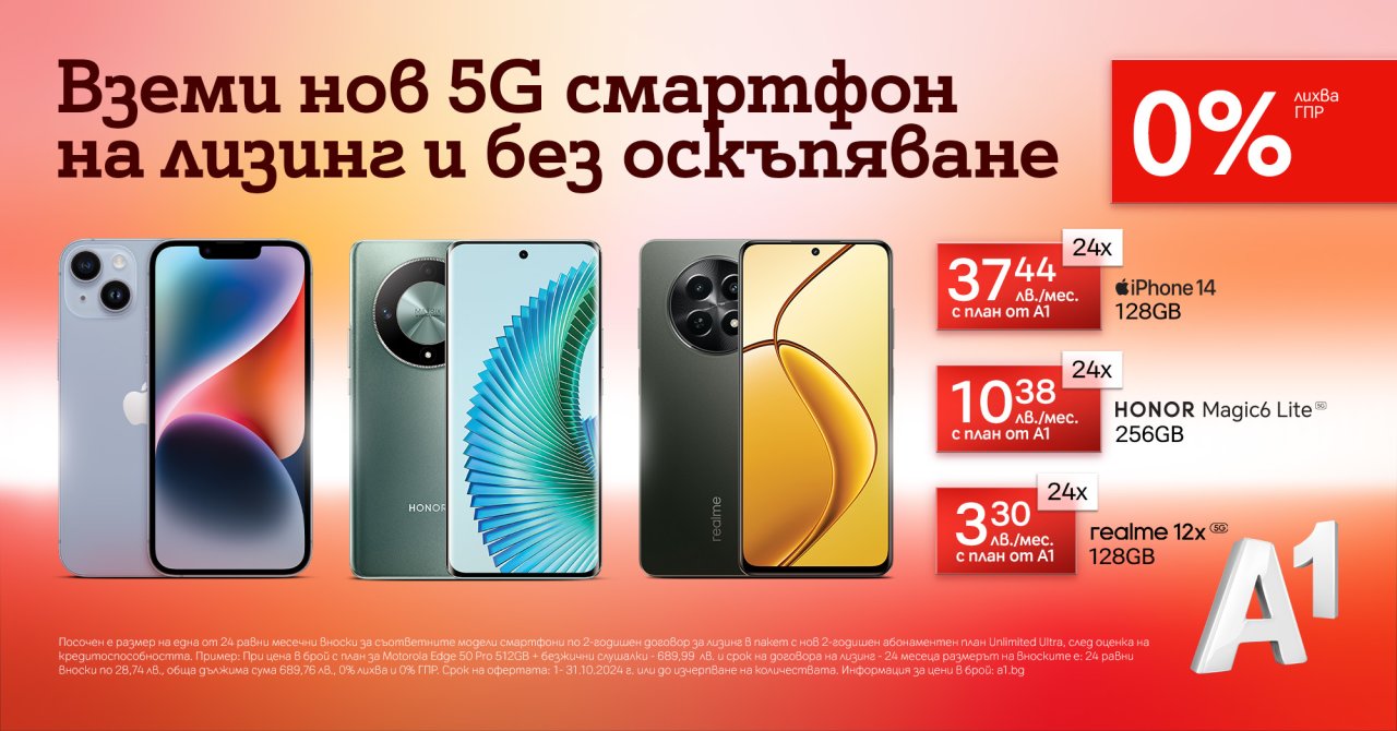 - Вземи нов 5G смартфон на лизинг с 0% лихва за 24 месеца от А1.