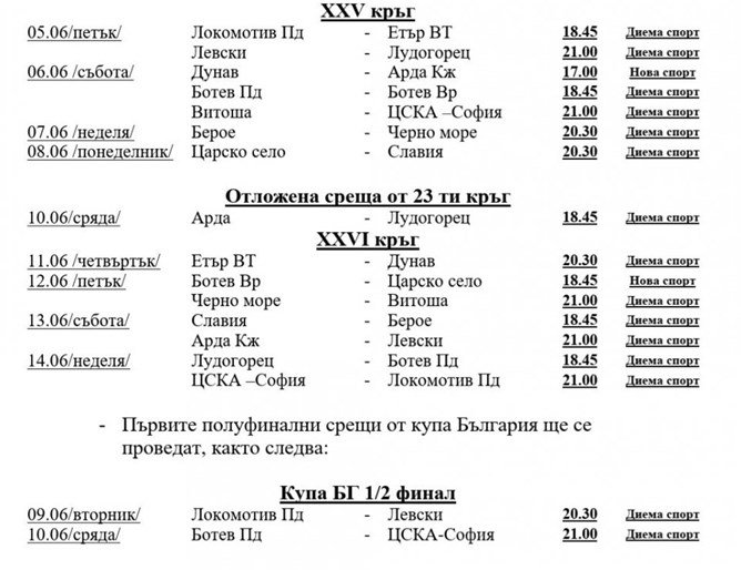 Дербито „Левски“ – „Лудогорец“ ще бъде още в първия ден от подновеното първенство по футбол – 5 юни. На следващия ден (6 юни) „Витоша“ ще посрещне ЦСКА, а „Берое“ ще се изправи срещу „Черно море“ на 7 юни.