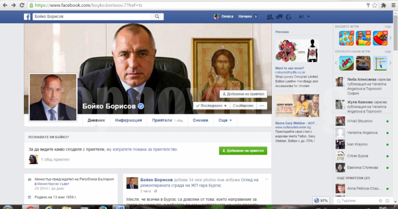Не излиза извън тези рамки и премиерът Бойко Борисов, който очевидно не заляга над Фейсбука сам, но пък пиарите му са много активни. Неговият профил е сред най-страстно поддържаните, с голямо количество снимки, видеа и жизнеутвърждаващи новини, които обаче са далеч от неговия стил на говорене.