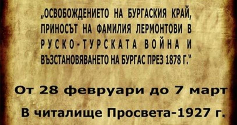 Гостуваща изложба на Регионалния исторически музей – Бургас ще бъде открита в Камено, съобщиха от местната Община. Тя е на тема „Освобождението на Бургаския край, приносът на фамилия Лермонтови в руско-турската война и възстановяването на Бургас през 1878 г.”.