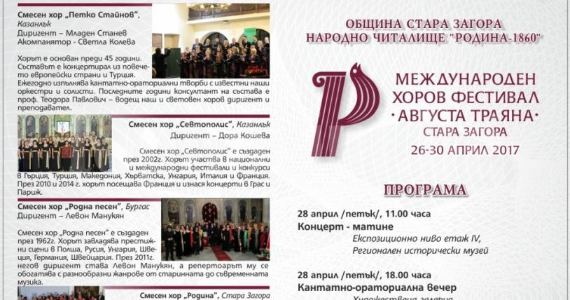 Първият Международен хоров фестивал „Августа Траяна“ започна в Стара Загора. Участват 13 хорови формации от България и чужбина, с над 350 хористи. Градът на липите е представен от Октета за източно-православна музика „Свети Йоан Дамаскин“, Дамския камерен хор „Библиофония“, Туристическия хор „Средногорски звуци” при Туристическо дружество „Сърнена гора” и Смесен хор „Родина”.
