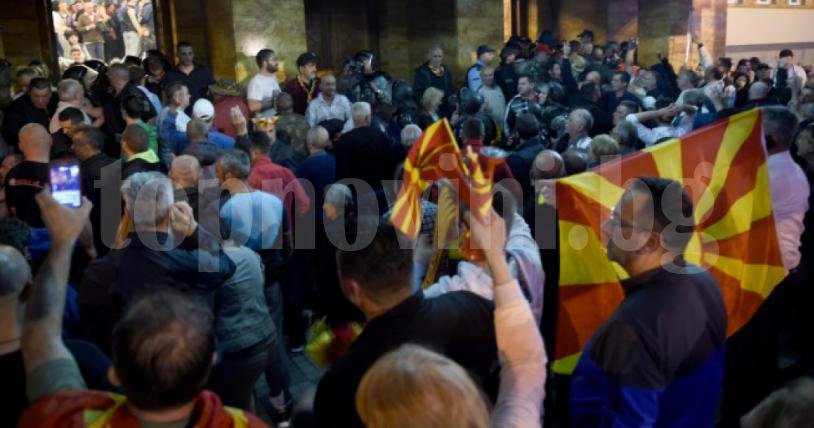 В този момент пред сградата на НС и в центъра на Скопие имаше хиляди протестиращи. Част от тях влязоха в парламента, стигна се до сбиване, при което пострадаха няколко депутати.