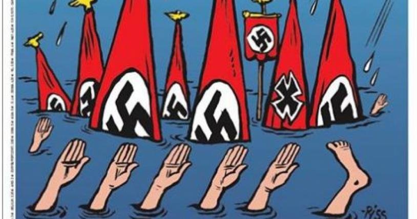 На карикатурата, която беше публикувана във Фейсбук профила на ежеседмичника се вижда знамето на Третия райх наполовина под вода. От водата се появяват и ръце, изпълняващи нацисткия поздрав. Към рисунката има текст, който гласи: "Бог има! Той удави всички неонацисти в Тексас".