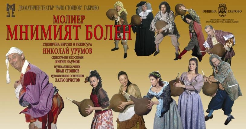 Комедия на маските, на перуките, на танците, на пищните костюми – това е Молиеровият театър, такова е и габровското представление. Арган – един хипохондрик, който живее с чувството, че е много болен, а „услужливи” хора около него подклаждат страховете му. Той дори е готов да жертва щастието на дъщеря си, женейки я за един малоумен доктор, само за да има постоянно лекар под ръка.
