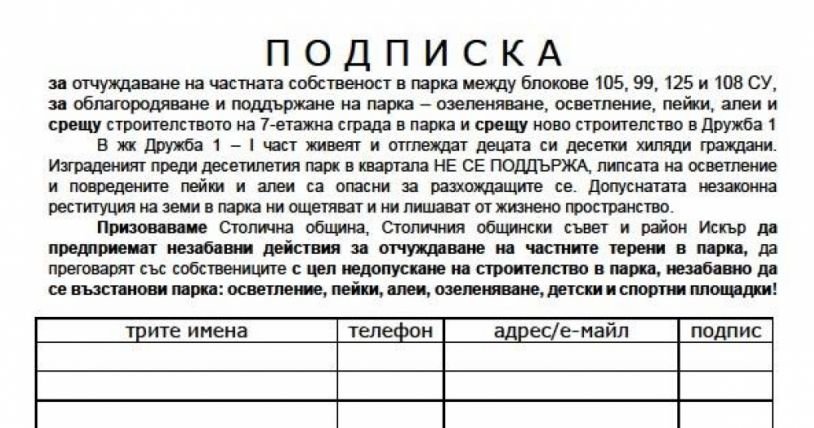 Жители на столичния квартал "Дружба" протестират срещу намеренията за строителство в парка между блокове 105, 99, 125. Хората настояват паркът да бъде облагороден и поддържан и не искат в него да бъде изграждан 7-етажен блок, каквито са намеренията на частен инвеститор.