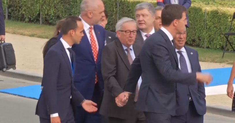 В социалните мрежи обаче се разрази дебат дали Жан-Клод Юнкер всъщност не е пиян, тъй като в един момент той изпитва трудности дори да се задържи прав. На кадрите се вижда как премиерите на Холандия и Португалия и президентът на Украйна го подхващат, за да не падне.