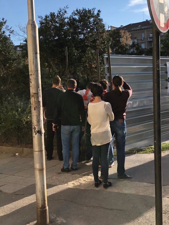 Скандалите около ремонтните дейности не утихнаха и през уикенда, когато сутрешните блокове и сайтовете продължаваха да търсят качествено ли са изпълнени строителните дейности. Вероятно затова и минаващите през района се тълпят около оградите и дори се опитват да снимат през тях с телефоните си.
