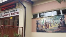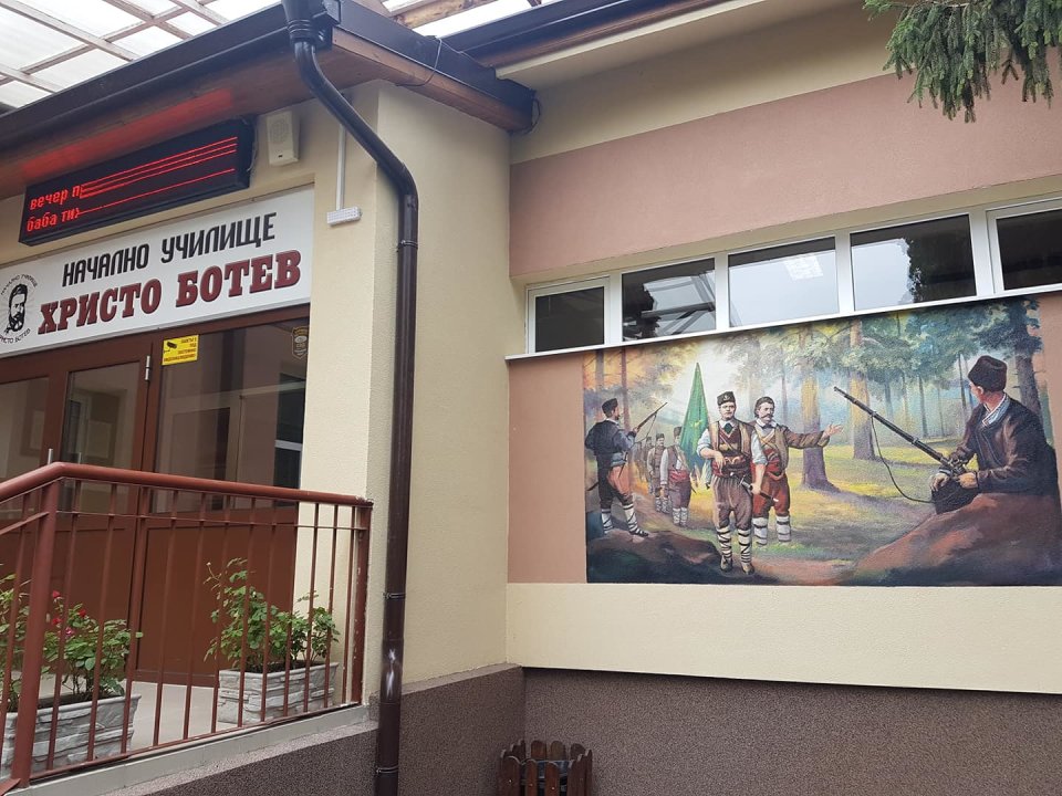Мозайка от азбука и патриотични рисунки и надписи блестят на фасадата на училището. Портата се заключва за сигурността на децата, а домофонна система улеснява комуникацията между персонал и външни лица.