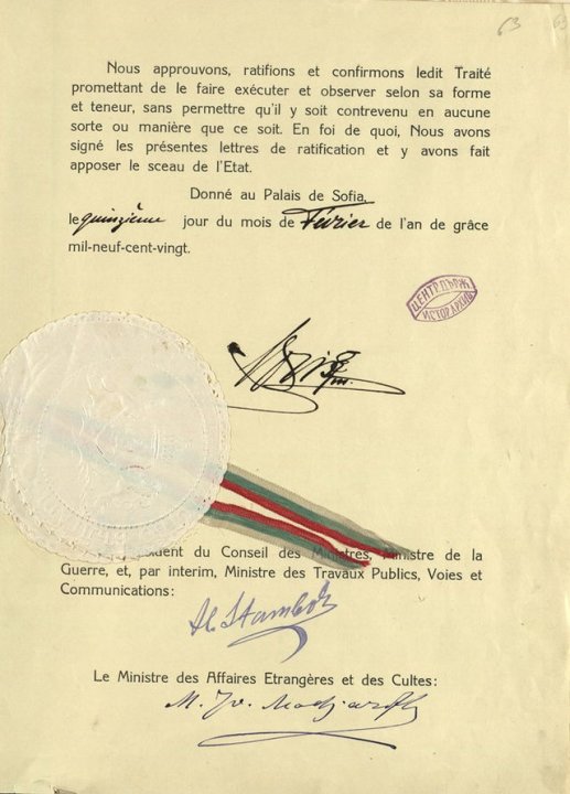 В края на 1919 г. българска делегация, начело с министър-преАндседателя Александър Стамболийски е изпратена към Франция. Отношението на французите към пратениците е било като към военнопленници. Техният достъп до външния свят е бил изключително ограничен, като още с пристигането си в Париж на българите е било забранено да излизат от хотела, в който са настанени без специално разрешение.