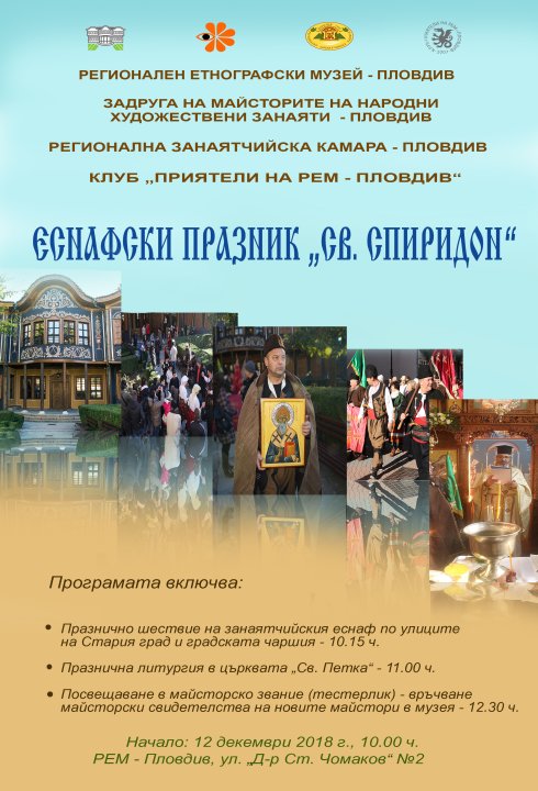 Занаятчийския ритуал, празнуван още от епохата на Възраждането, ще бъде възпроизведен в двора на Етнографския музей в Пловдив в сряда, в деня на Свети Спиридон. Празникът е известен в страната като „Денят на майсторите“. Почита се като закрилник на грънчарите, керемидчиите, тухларите, обущарите, казанджиите и др.