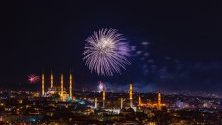 Кметът на Одрин Реджеп Гюркан поздравява на български и гръцки език от хоругви, провисени в турския град.