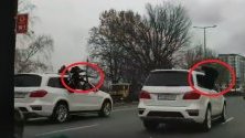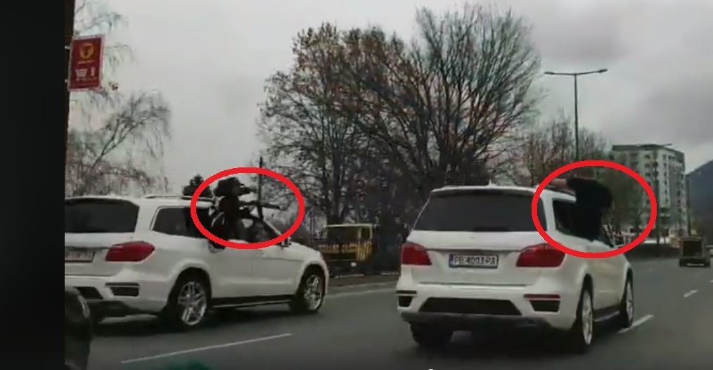 На кадрите се вижда, че всеки един от мъжете е седнал на рамката на отворен заден прозорец на бял джип "Мерцедес" и държи оръжие.