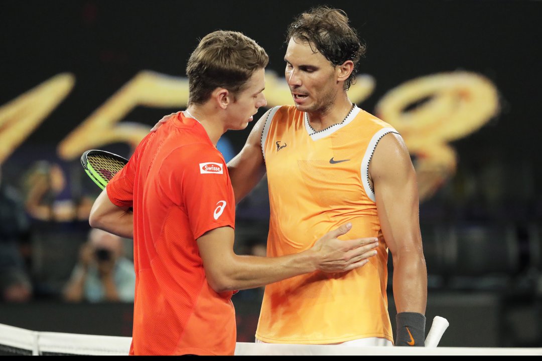 Първата ракета на Австралия не успя по никакъв начин да противодейства на един от фаворитите в турнира. Надал даде само гейм на 19-годишния Де Минор в първия сет и два във втория. Испанецът проби сервиса на съперника още в първия гейм на третата част и до края на остави съмнения в превъзходството си, като затвори мача с 6:4 със шестия си мачбол след 2:24 часа игра.