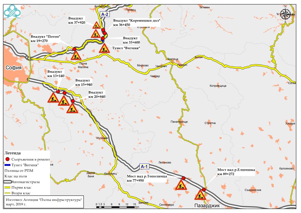 От 26 март движението от 33-ти до 40-ти километър на АМ „Хемус“ се осъществява двупосочно в платното за София поради ремонта на два виадукта - при 36-ти км /„Коренишки дол“/ и при 37-ми км в платното за Варна. През миналата година беше обновено платното за София на двете съоръжения и сега трафикът преминава по тях. Очаква се предвидените дейности да завършат до края на строителния сезон. Ще се ремонтира както пътното платно, така и колоните на съоръженията.