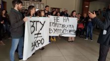 Студенти от Великотърновския университет негодуват срещу предумишлено провалените според тях избори за допълване на студентската квота в Общото събрание на ВТУ. Те се събраха на спонтанна демонстрация пред залата на Академическия съвет на университета, за да изразят своето недоволство.