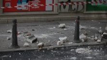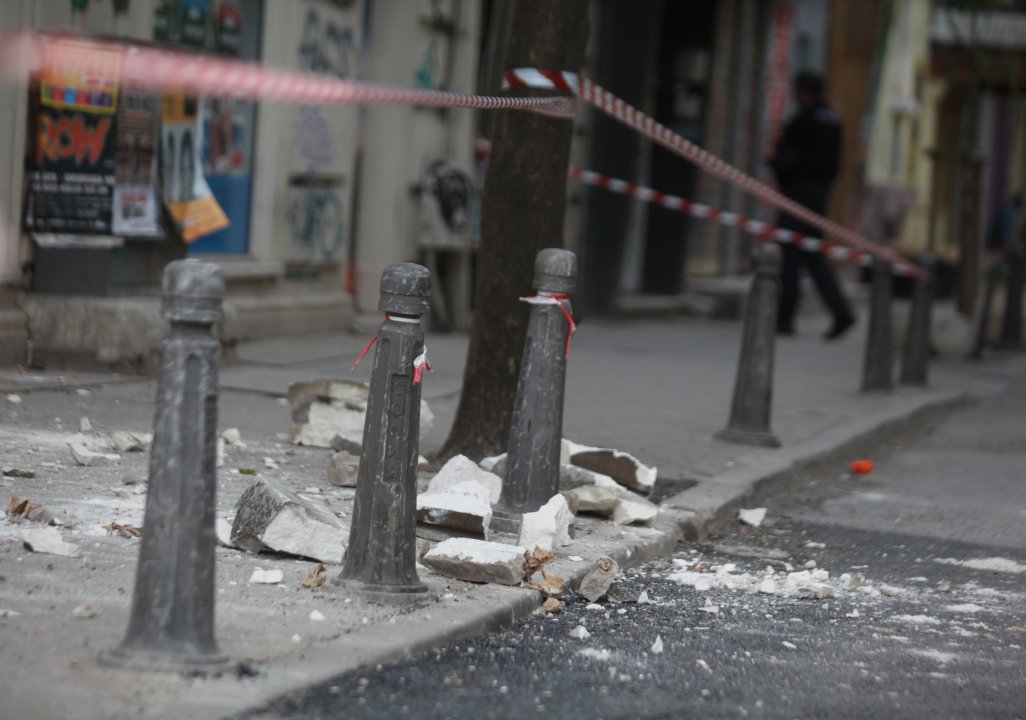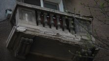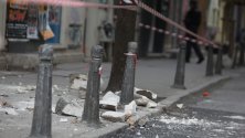 Огромните късове са паднали на тротоара от терасата на третия етаж тази сутрин. Районът е отцепен със заградителни ленти от органите на реда.