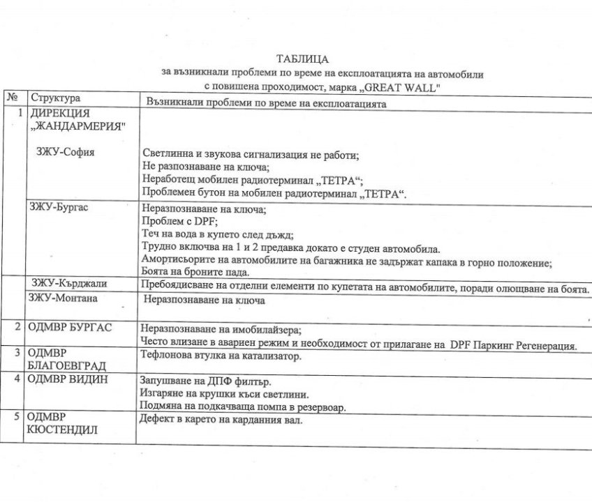 От МВР предоставиха списък с автомобилите, които са дали дефекти, както и какви точно са проблемите. Дефекти по ходова част, паднала боя, проблем със светлините, радиостанции и тетри, отказване на екраните с дни, изключване на скоростите по време на движение - това са малка част от проблемите с полицейските коли.