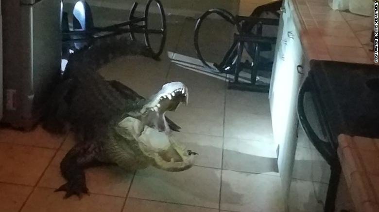 We know you've been chomping at the bit for more visuals from today's alligator trespassing in Clearwater The male alligator was 10 to 11 feet in length. During the apprehension, the alligator knocked over several bottles of wine. The red liquid in the video is wine, not blood. pic.twitter.com/x6ktib6ajl— Clearwater Police Department (@myclearwaterPD) 31 май 2019 г.