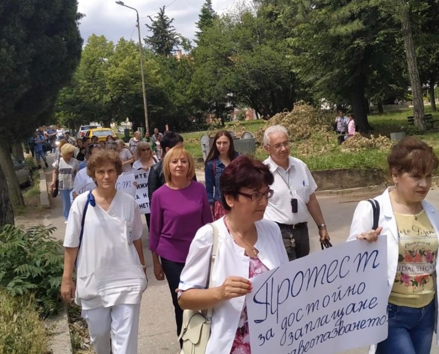Медицински работници от УМБАЛ „Проф. д-р Стоян Киркович“ протестираха пред болницата днес, подкрепени от омбудсмана Мая Манолова, след което проведоха шествие из града. В него обаче, по твърдение на медицинските специалисти, заради натиск и заплахи за уволнение, се включиха едва двайсетина професионалисти по здравни грижи.