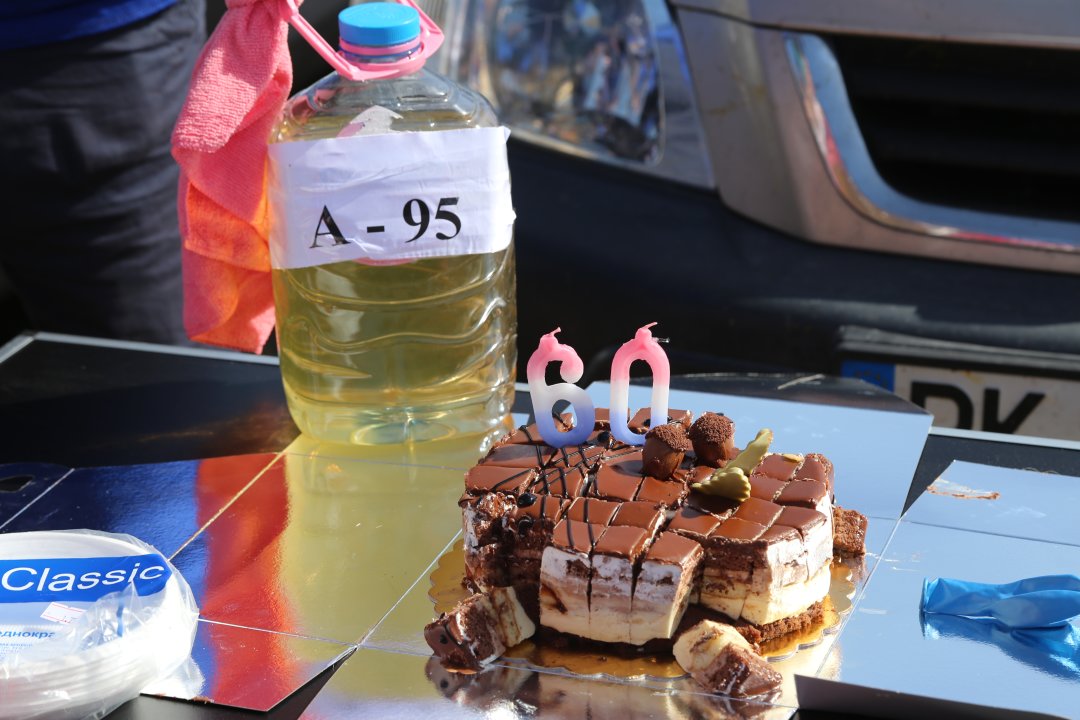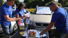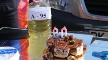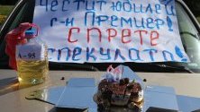 „Честит юбилей, г-н премиер! Спрете спекулата!”, пише на голям плакат, поставен върху предното стъкло на автомобил, а пред него протестиращите черпят с торта и с туба от най-масовия бензин А-95.