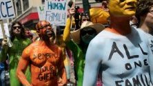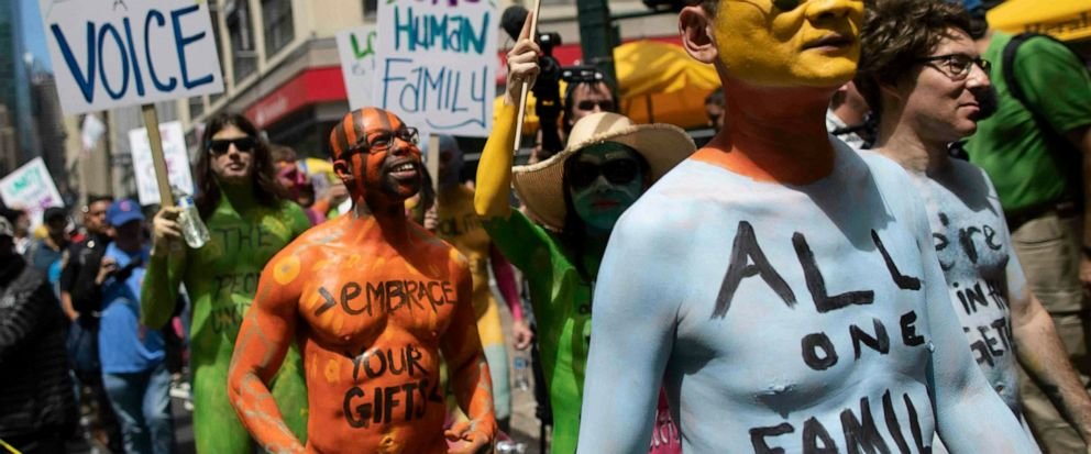 Няколко десетки души се събраха на площад „Таймс Скуеър“ В Ню Йорк, където се съблякоха голи и изрисуваха телата си в знак на протест срещу разделенията в света.