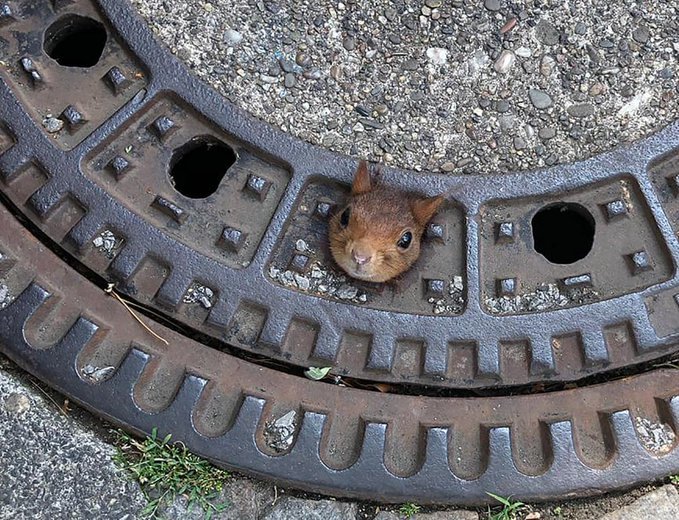 Пожарната, полицията и ветеринарните служби обединиха сили, за да спасят катеричка, която бе заклещила мъничката си глава в капака на шахта в западния германски град Дортмунд.