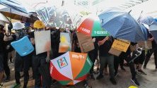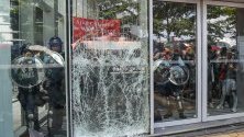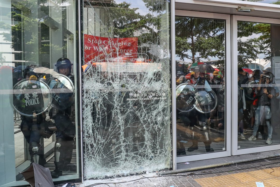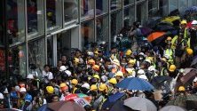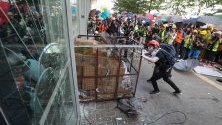 Антиправителствените протестиращи в Хонконг разбиха прозорците на Законодателния съвет и се опитаха да нахлуят в сградата, като понесоха метална количка през стъклените врати, докато полицията отговаряше с лютив спрей.