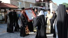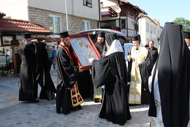 Снощи с архиерейска вечерня в храм "Света Троица" в Банско стотици жители и гости на града посрещнаха копие на чудотворната икона на св. Богородица Скоропослушница. Кметът Георги Икономов лично посрещна монасите, които носеха иконата и присъства на службата.
