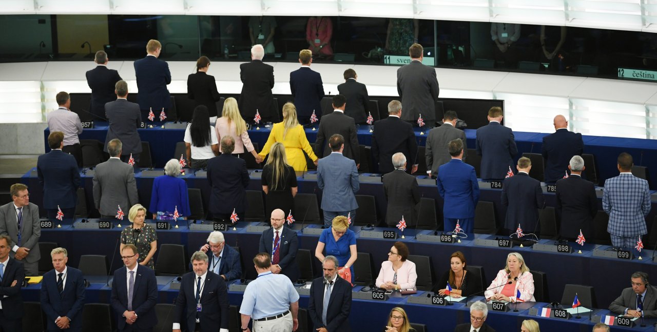 Brexit Party MEPs turn their backs as the EU's anthem, Ode to Joy, is played as they take their seats in the new European Parliament