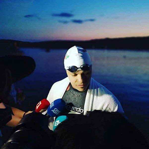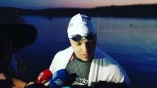 31-годишният Цанко Цанков, който вчера постави рекорд по преплуване на Бургаския залив и дистанцията от Нос Емине до Маслен нос, говори веднага след стъпването на твърда земя и секунди след като спря хронометрите на 14 часа, 24 минути и 34 секунди.