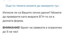„Изтекли ли са Вашите лични данни? Можете да проверите като вкарате ЕГН-то си в долната форма. В отговор на множество запитвания: Платформата и нейните автори няма да предоставят по-конкретни детайли”, откриваме на сайта.