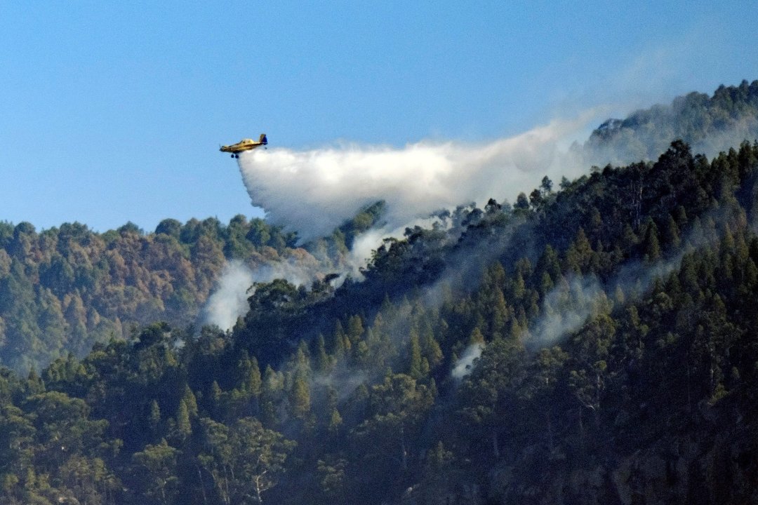Огънят гори от събота, като пожарникарите казаха, че на места пламъците достигат 50 метра височина и гасенето е изключително трудно, дори от въздуха.