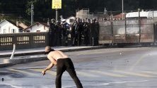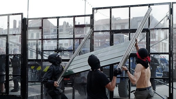 Протестиращите се опитаха да съборят полицейските ограждения и да преминат отвъд тях. Освен това демонстрантите къртят парчета от приземни етажи на сградите и от тротоарите и след това ги хвърлят по служителите на реда.