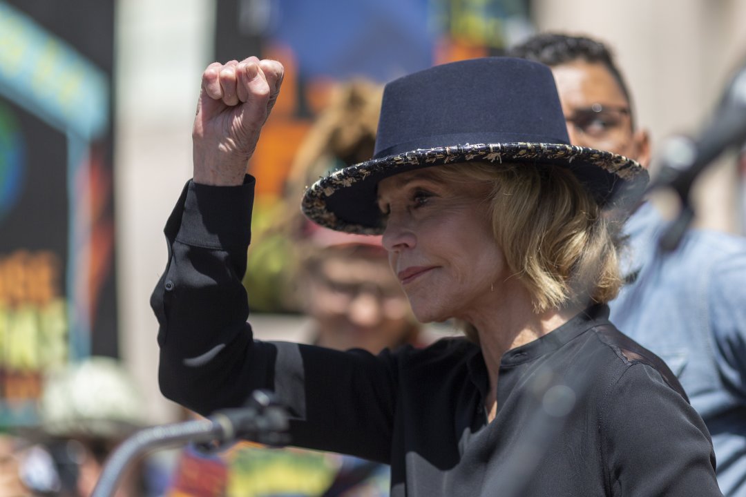 Фонда, облечена в яркочервено гащеризон, скандираше лозунги за действия срещу климатичните промени, преди да й бъдат сложена белезници и да бъде отведена под аплодисменти от протестиращите съмишленици.