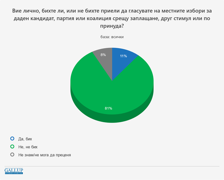„Галъп интернешънъл“ за поредна година провери каква е нагласата към „стимулирано“ или „наложено“ гласуване. В последното националнопредставително изследване на агенцията, проведено само преди дни, беше зададен въпросът: „Вие лично, бихте ли, или не бихте приели да гласувате на местните избори за даден кандидат, партия или коалиция срещу заплащане, друг стимул или по принуда?“ Разбира се, няма кака да се очаква, че хората ще бъдат докрай искрени при такъв въпрос, но все пак степента, в която подобни неща се признават, е показателна и за цялостната величина на явлението „контролиран вот“.