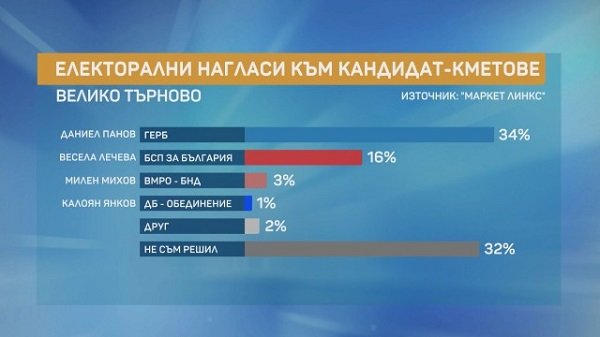 Прогнозите за Велико Търново са балотаж между кандидатите на ГЕРБ и „БСП за България” – Даниел Панов и Весела Лечева. Това показват резултатите от експресно проучване на „Маркет Линкс”, направено по поръчка на bTV и проведено сред 404 лица над 18 г., в периода 04-07 октомври по метода на прякото-лично интервю.