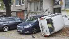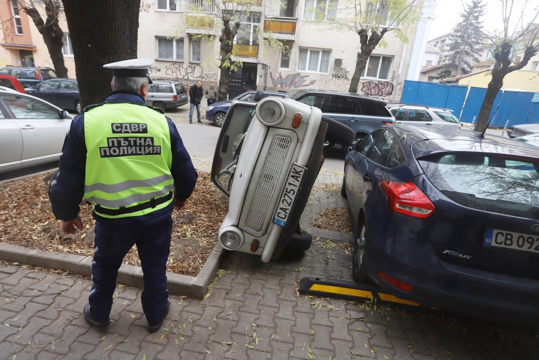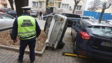 Автомобилът е бил обърнат тази нощ, защото вчера той е бил паркиран на това място. Днес той е обърнат на две гуми, а син автомобил е заел мястото му. Според свидетеля, именно вторият водач е обърнал вече паркиралия, който му е пречел.
