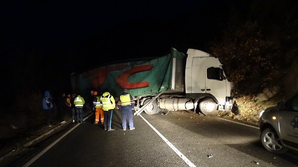 Рано сутринта тежкотоварен камион с ремарке се удари в крайпътен скат и препречи цялото платно в отсечката между Кресненските ханчета и разклона за село Ощава. В района се образуваха километрични задръствания.