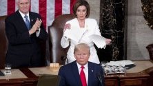 Когато приключи речта, лидерът на Демократическата партия Нанси Пелоси демонстративно вдигна копието си от обръщението на Тръмп и го скъса. Тя изслуша словото на Тръмп за успешното му управление със стиснати устни, седейки зад гърба му. След пристигането си в залата Тръмп наруши обичая, като не се ръкува с Пелоси, която е говорител на Камарата, въпреки че тя му подаде ръка.