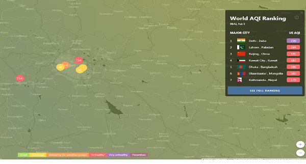 В неделя градът с най-мръсен въздух в света отново е Делхи в Индия, следван от Лахор в Пакистан, на трето място е столицата на Китай – Пекин. На четвърто място е Кувейт Сити, следват Дака в Бангладеш, столицата на Монголия – Уланбатор и столицата на Непал – Катманду. Милано в Италия е на 11-то място по замърсяване на въздуха. В първите 15 града са още Сараево в Босна и Херцеговина, както и столицата на Сърбия – Белград. Скопие в Северна Македония е с една позиция след София по замърсяване на въздуха