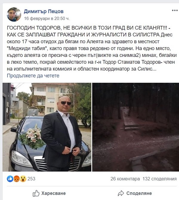 „ГОСПОДИН ТОДОРОВ, НЕ ВСИЧКИ В ТОЗИ ГРАД ВИ СЕ КЛАНЯТ!!! - КАК СЕ ЗАПЛАШВАТ ГРАЖДАНИ И ЖУРНАЛИСТИ В СИЛИСТРА Днес около 17 часа отидох да бягам по Алеята на здравето в местност "Меджиди табия", както правя това редовно от години. На едно място, където алеята се пресича с черен път(вижте на снимка2) минах, бягайки в леко темпо, покрай семейството на г-н Тодор Стаматов Тодоров- член на изпълнителната комисия и областен координатор за Силистра на ПП ГЕРБ. Докато минавах покрай тях, изведнъж г-н Тодоров се нахвърли върху мене физически и опита да ме сграбчи с ръце. След кратка физическа схватка успях да се измъкна и застанах на около 1 метър от него. Той пак тръгна мене и започна да ме кани по любезно и оказа се лицемерно, към тях. Аз приближих да чуя какво има да ми каже. Тогава той изведнъж започна да ме дърпа грубо с едната си ръка и да сочи към жена си Елица Тодорова - общински съветник от ГЕРБ от този мандат, и с пяна на уста да ми крещи - как щял да ме смачка: "Ето я жена ми, майката на моите деца(те двете деца също бяха там), ето пиши за нея...ЩЕ ТЕ СМАЧКАМ, ЕЙ, ЧУ ЛИ! ЩЕ СМАЧКАМ, КАТО СВЪРШИ ПОЛИТИКАТА, ЧУ ЛИ! ПЪРВО ТЕБЕ ЩЕ СМАЧКАМ! ЧУ ЛИ! ..
