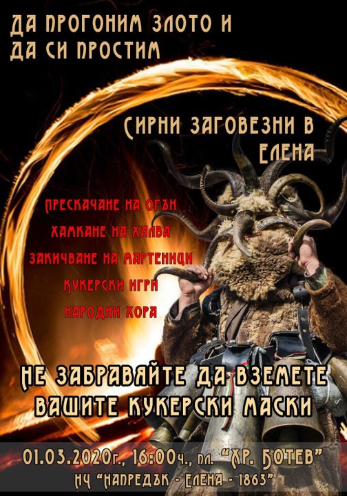 Народно читалище „Напредък-1863“ в Елена организира за първа година празникът Сирни заговезни. Той ще се проведе на 1 март от 16 часа на площад Христо Ботев“ в града и ще премине под надслов „ Да прогоним злото и да си простим“.