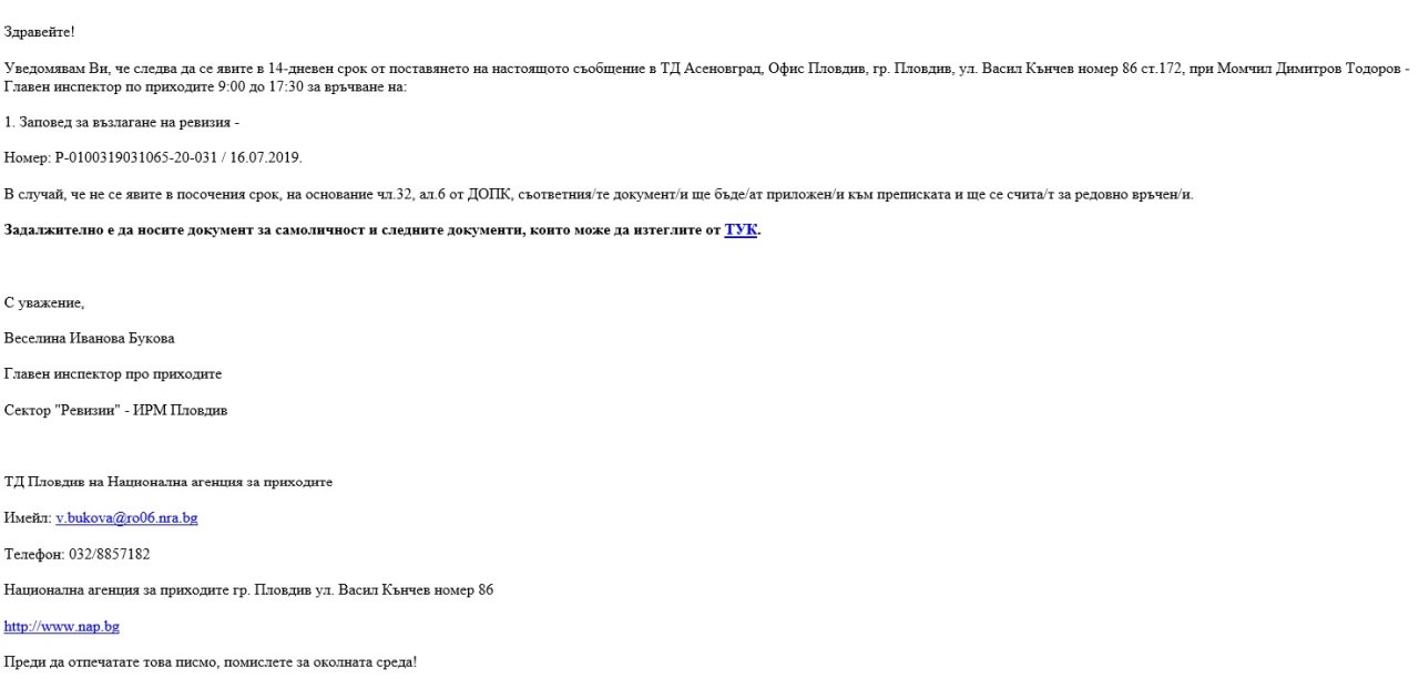 Разпространяват се фалшиви имейли от името на НАП, предупреждават от приходната агенцията. Те представляват съобщение за предстояща ревизия, като дори се споменава име на „служител“ в данъчната администрация. Писмата приканват получателите им да се явят на адрес, на който се твърди, че има офис на НАП, и да носят документ за самоличност, както и да последват линк за повече информация. Съдържанието е идентично с това на фалшиви имейли, изпращани от името на НАП през октомври м.г.