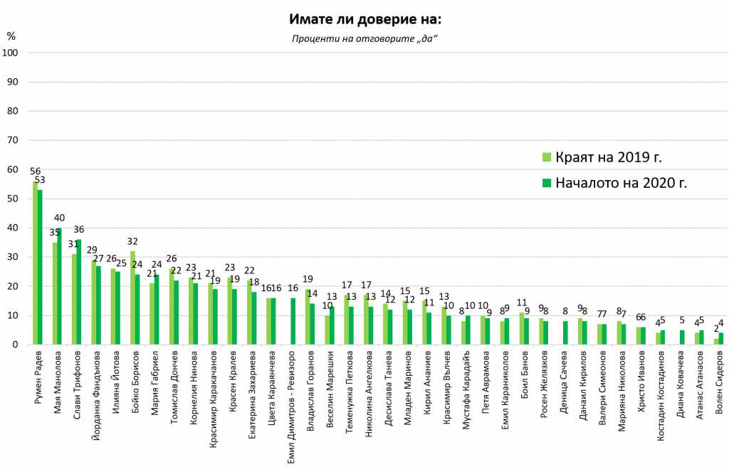 Сред основните публични фигури с най-сериозно доверие продължават да се ползват Румен Радев, Мая Манолова и Слави Трифонов. При Радев тепърва ще трябва да се регистрира влиянието на новия етап в отношенията му с кабинета, които вече създават определени рискове за част от популярността. Манолова укрепва доверието си, макар и на сравнително по-ниски от преди нива – след като закономерно загуби немалко доверие при напускането на длъжността омбудсман и участието си в местните избори. Доверието при Слави Трифонов пък се колебае около познатите напоследък равнища от около една трета и две пети. Сравнително добри обществени оценки имат също Йорданка Фандъкова, Илияна Йотова, Бойко Борисов, Мария Габриел и т.н.