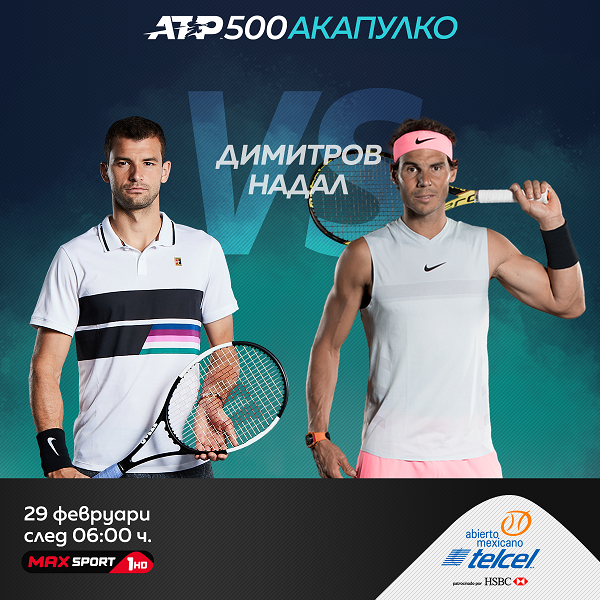 Въпреки колебливото начало на сезона, Григор Димитров намери играта си на ATP 500 турнира в Акапулко и записа три последователни победи над Дамир Джумхур, Адриан Манарино и Стан Вавринка. Това осигури на водещата ракета на България първия му полуфинал за годината, където го чака не кой да е, а световният №2 Рафаел Надал. Двубоят е последен в програмата на Централния корт в мексиканския курорт и ще започне след 06:00 часа в събота сутринта, като ще се предава пряко по MAX Sport 1. Победителят от мача между Димитров и Надал ще спори за трофея срещу Джон Иснър или Тайлър Фриц, които играят преди тях. Финалът ще се проведе на 1 март сутринта от 05:00 ч. и отново ще се предава на живо по MAX Sport 1.
