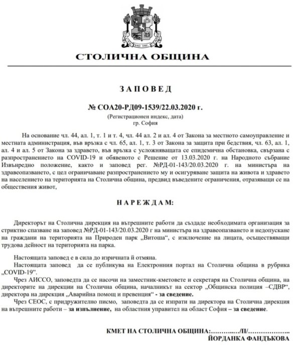Йорданка Фандъкова спря достъпа до природен парк „Витоша“. Това стана ясно от заповед на кмета до директора на СВДР, в която се нарежда да бъде създадена организация за недопускане на граждани до парка.