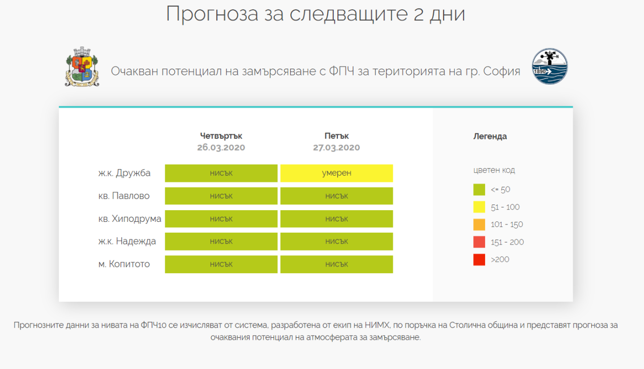 В последните дни замърсяването с ФПЧ във всички райони на столицата е ниско. Чист е въздухът включително и в едни от традиционно най-замърсените локации – кварталите „Павлово“ и „Надежда“. Предварителните прогнози сочат, че единствено утре в ж.к „Дружба“ замърсяването ще бъде умерено.