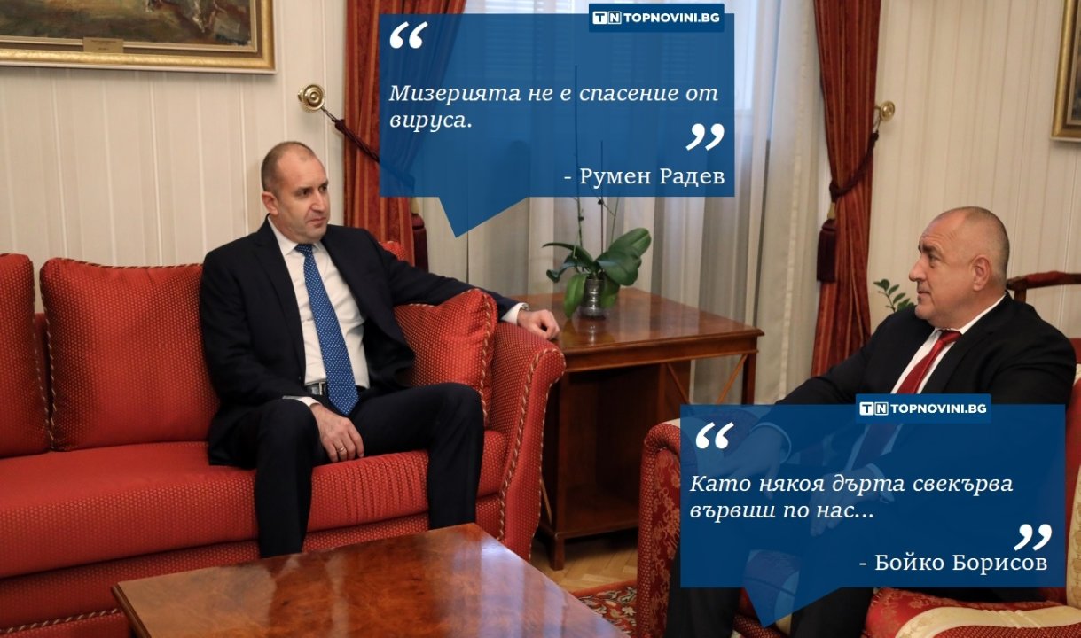 "Мизерията не е спасение от вируса...Затова трябва да си поставим ясна национална цел – възможно най-бързо, управляемо и безопасно връщане към относително нормален ритъм на живот, към производство, към свободно движение на хора и стоки... Част от мерките в извънредния закон и приетите впоследствие с решение на Министерски съвет се определят и от гражданите, и от бизнеса като недостатъчни, а някои от тях и за неудачни. Хората в нужда очакват помощ, а не оферта за заем... В условия на криза реалната помощ е безвъзмездната...Необходимо е в спешен порядък да се преразгледат и някои разпоредби на приетия в бързина и хаос закон, които блокират икономическия живот". Това обяви днес президентът Румен Радев във връзка с предложението на правителството за удължаване на извънредното положение в страната заради коронавируса.