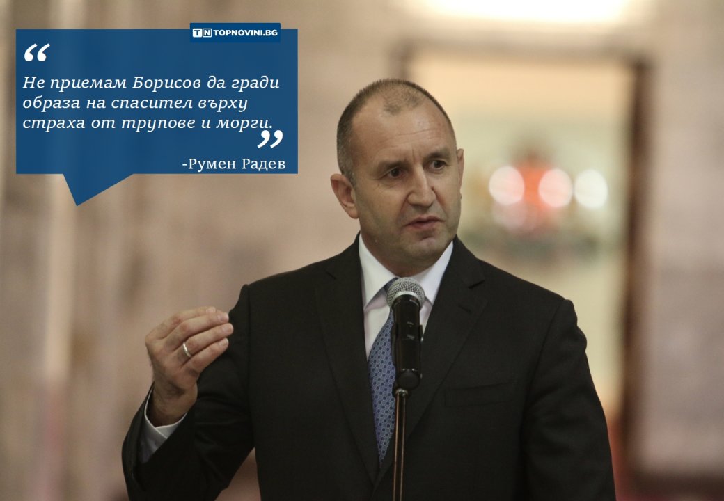 "Премиерът е много опитен и обигран политик. Не хвърля думи на вятъра. Не приемам да си гради образа на спасител върху страха, който сам разпръсква- с трупове, морги, масови гробове, с ад, който слиза тук. А ако нещо се обърка ще има виновен - Радев...Не е време за емоции, избухвания и сърдити пози. Аз в този спектакъл няма да участвам. Премиерът трябва да е наясно, че нито президентът, нито народът са публика, от която се очаква по всяко време аплодисменти". Така президентът Румен Радев коментира поведението на премиера.