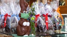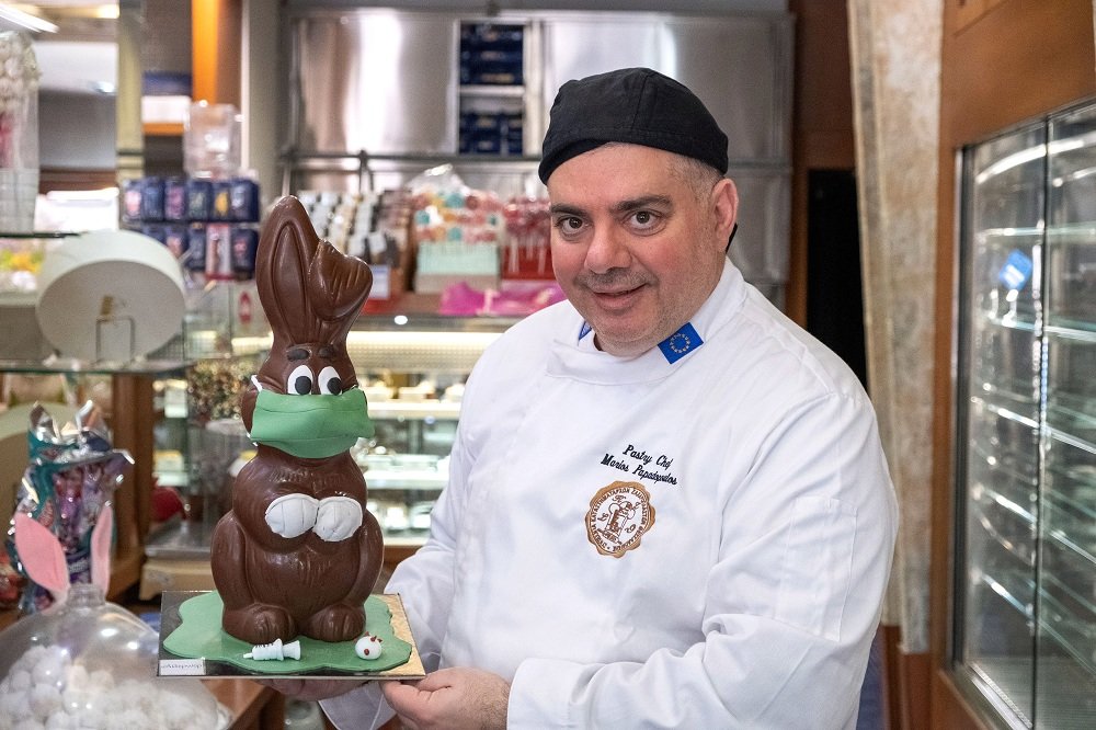 Шоколадови зайчета, носещи защитни маски, надничат от рафтовете в сладкарница в северната част на Атина. Собственикът на магазина Тасос Вазакас споделя, че иска да даде на хората причина да се усмихват насред пандемията от коронавирус, предаде БГНЕС.